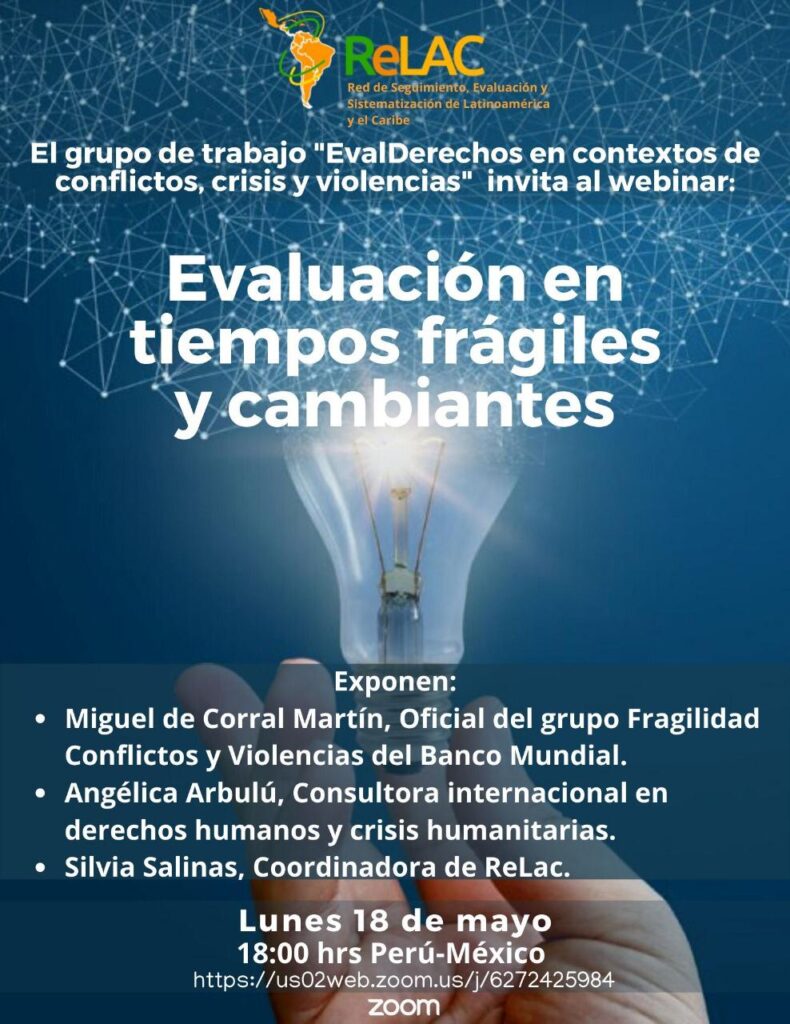 Facilitación: Emma Rotondo, co coordinadora del grupo de trabajo “Eval derechos en contextos de conflicto, crisis y violencias” de ReLAC e integrante de la directiva de la Red Peruana de Seguimiento y Evaluación (EvalPerú).
